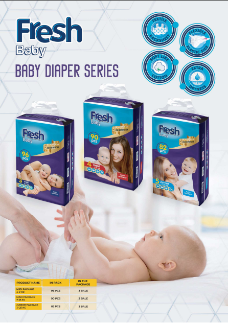 Your Baby’s Comfort is Our Priority. Fresh Baby diapers provide all-day dryness with their ultra-absorbent layer and breathable outer surface. Complementing the series, Fresh Baby wet wipes represent purity with a pH balance suitable for the sensitive skin of newborns.